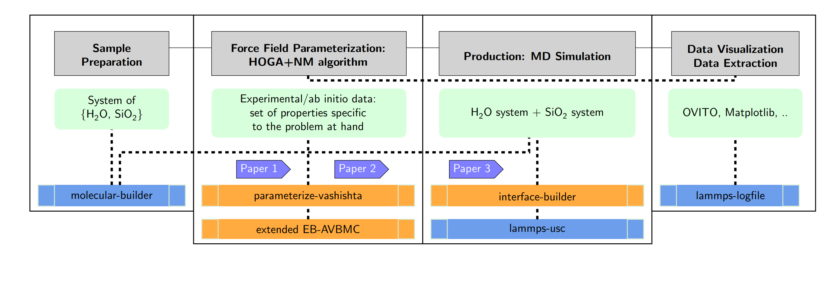 My research centers on developing interatomic potentials, specifically for water, silica, and their interactions, using a classical potential model. The figure above shows the general workflow we use for this project. My PhD work focused on refining the parameters of a reactive empirical potential, the Vashishta potential, which is widely used in silica simulations. I’ve extended its application to model water at thermodynamic conditions of the Earth’s crust, building upon its established success with other materials like silicond dioxide, silicon carbide and alumina. We published our work as follows: